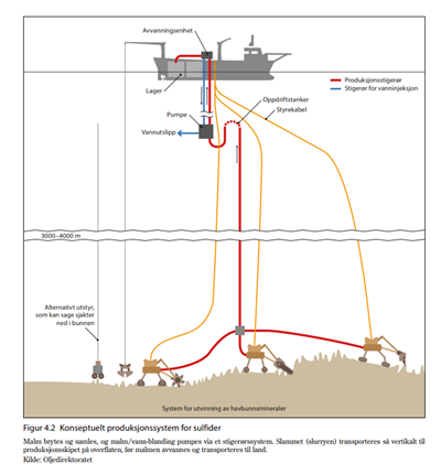 Et annet spørsmål er om masseforflytningene som ledd i havbunnsmineralvirksomhet utgjør «mudring fra skip» etter § 22-1. Teknologien rundt havbunnsmineralvirksomhet er ikke ferdig utviklet, men det er antatt i DNVs teknologirapport og i konsekvensutredningen ved åpningen av området for havbunnsmineralvirksomhet, at lete- og utvinningsvirksomhet utføres ved bruk av større fartøy på overflaten, og ved bruk av ROV/AUV, og andre maskiner som sendes til bunnen (se eksempelteknologi i figur 3).
